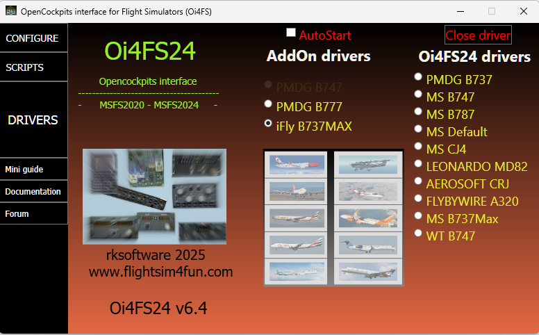 ​Drivers and scripts for PMDG 747, PMDG B777 and iFly737MAX airplanes are sold as add-on drivers to Oi4FS24.